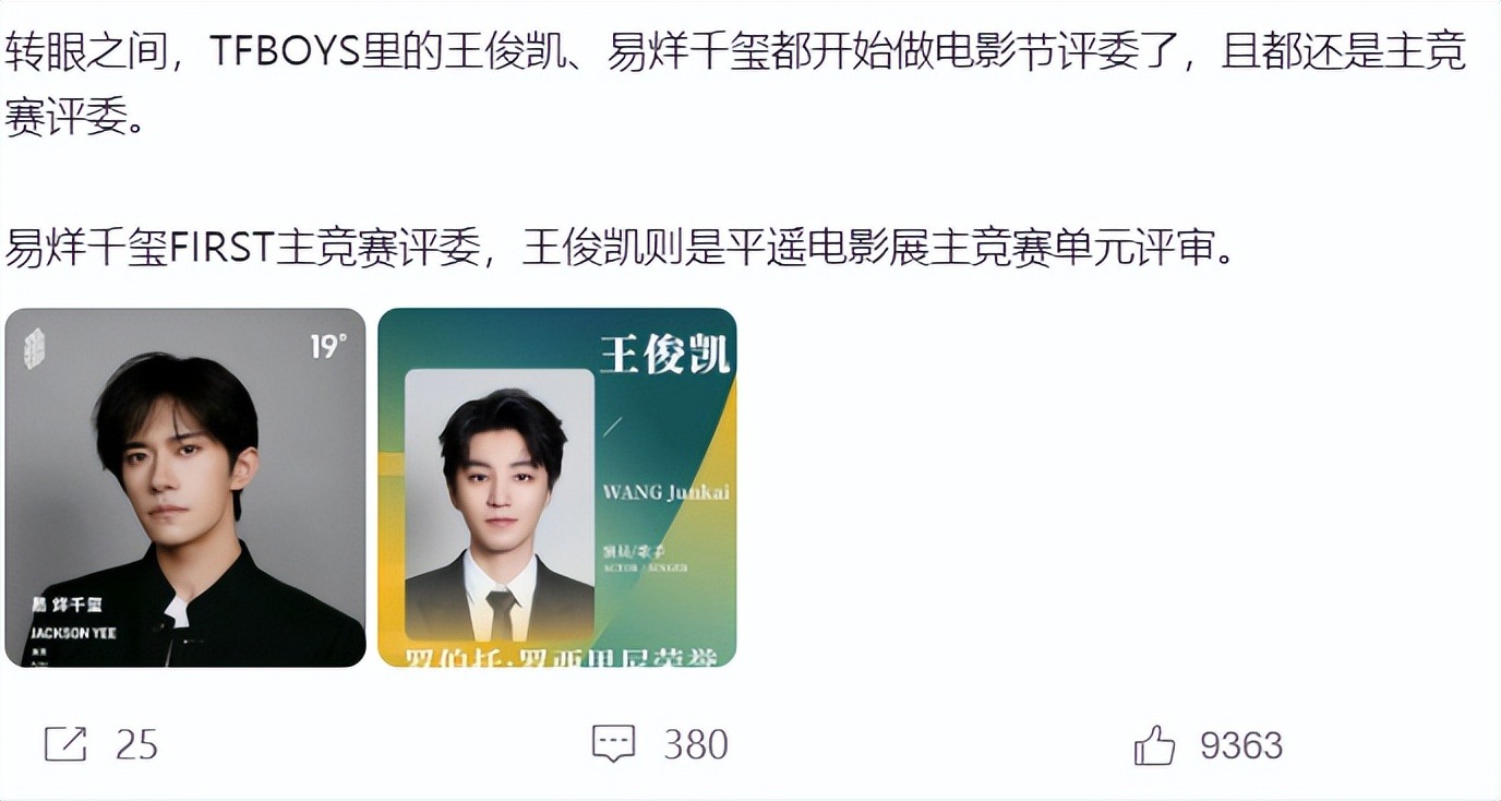近日,网上突然传出一条消息,易烊千玺和王俊凯竟成为电影节的评委,易烊千玺是FIRST主竞赛评委,而王俊凯是平遥电影展主竞赛单元评审。